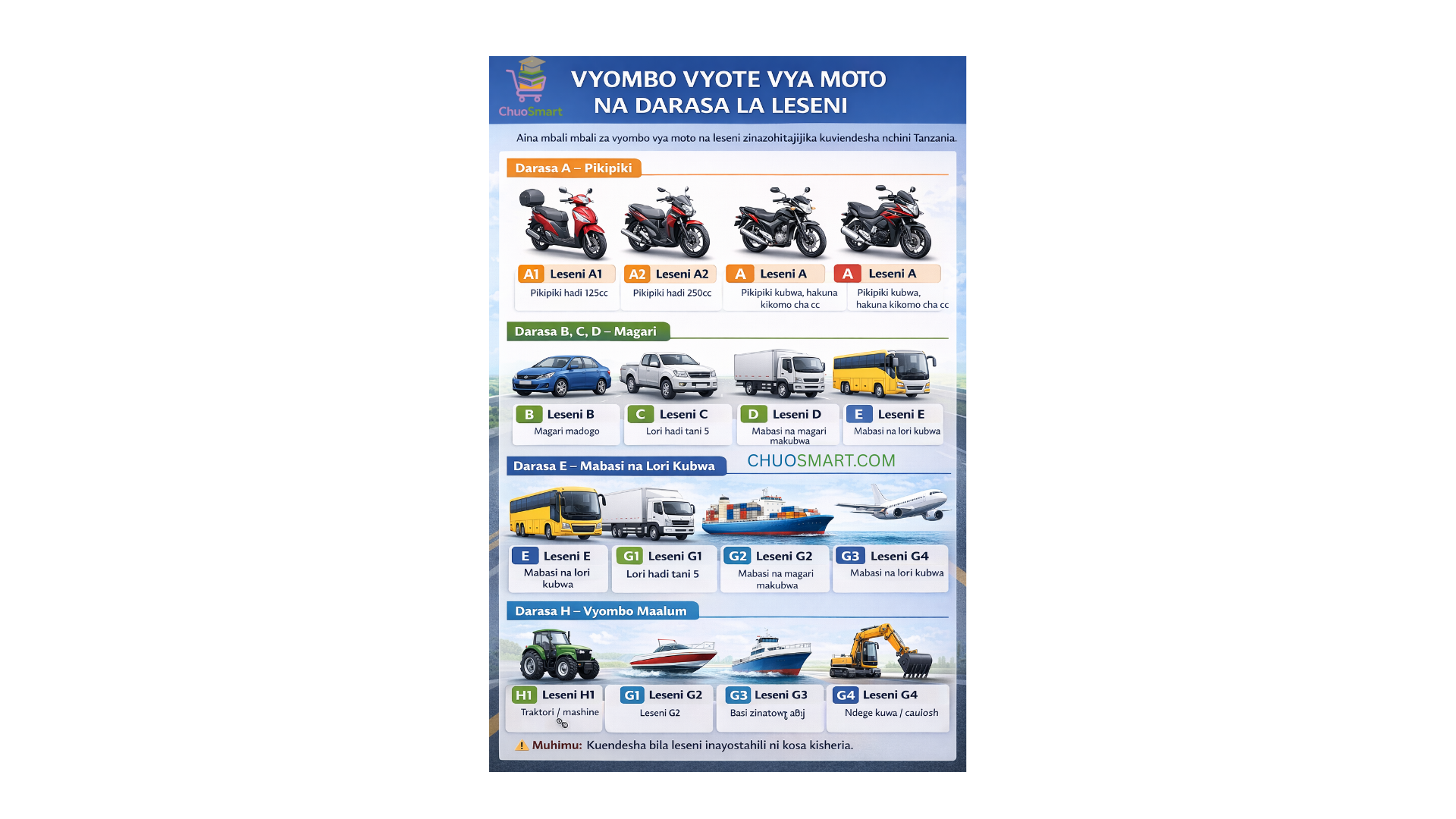 Kupita au kuendesha bila leseni ni kosa kisheria na kuna faini au adhabu kubwa.